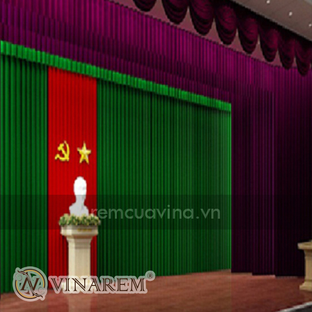 Không chỉ có màu đỏ mới được sử dụng chủ yếu cho vị trí rèm hội trường, mà màu xanh với việc làm nổi bậc tấm rèm màu đỏ ở giữa cũng được lựa chọn cho vị trí rèm hội trường. Với chất liệu vải chủ yếu là vải nhung hay vải thun, cùng độ vải dày dặn mang đến không gian lắp đặt sự sang trọng và hoàn hảo hơn cho không gian hội trường, hội nghị.