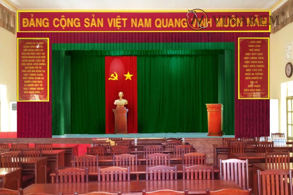 Rèm hội trường với thiết kế hiện đại cùng với tông màu bắt mắt, mang đến không gian hội trường thêm phần sang trọng hơn. Với sắc xanh lá làm chủ đạo, lớp bèo con sò phía trên cùng, lớp vải tím bao xung quanh và lớp vải đỏ tựa như cờ được đặt chính giữa làm nổi bậc không gian hội trường cũng như biểu tượng được trang trí.